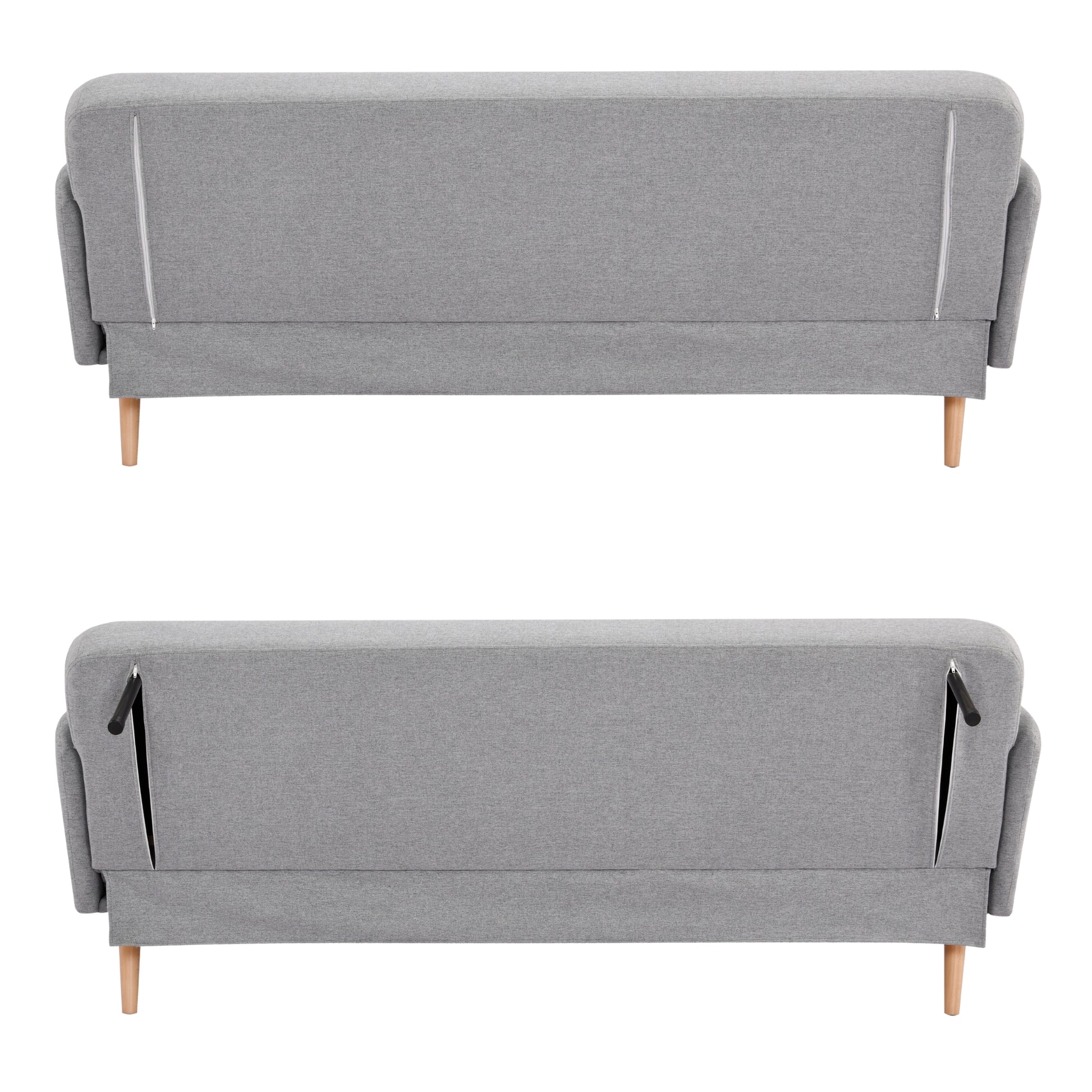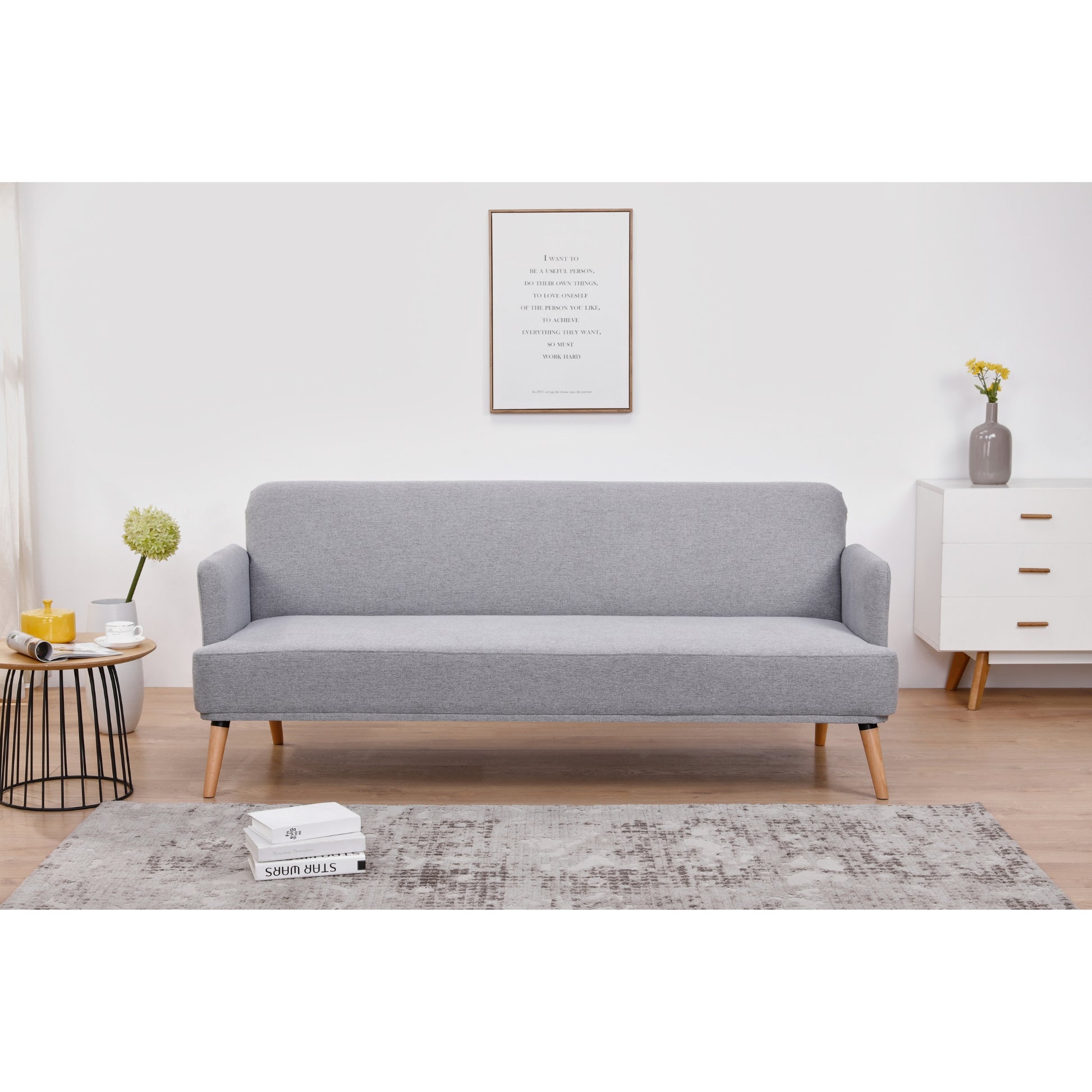This nicely-designed 3-seater sofa bed in grey is the epitome of comfort and relaxation. The Scandinavian-style furniture is upholstered in plush upholstery made of high-performance 100% polyester. The solid pine wood and plywood frame make it light and highly durable. The sturdy frame with seating support made of foam, fabric, and high-tensile S springs ensures blissful comfort when you sit, stretch, or sleep on it. Sturdy wooden legs in natural wood colour give the furniture a strong base. The sofa bed is easy to assemble. The long-lasting furniture comes with a 1-year warranty.